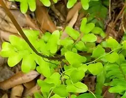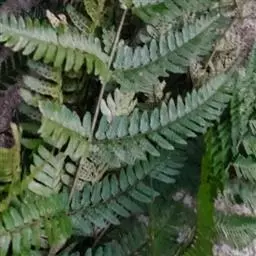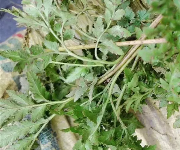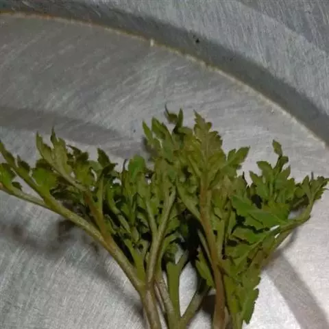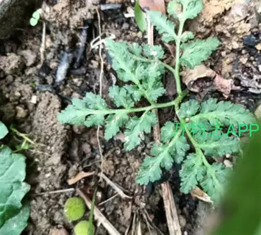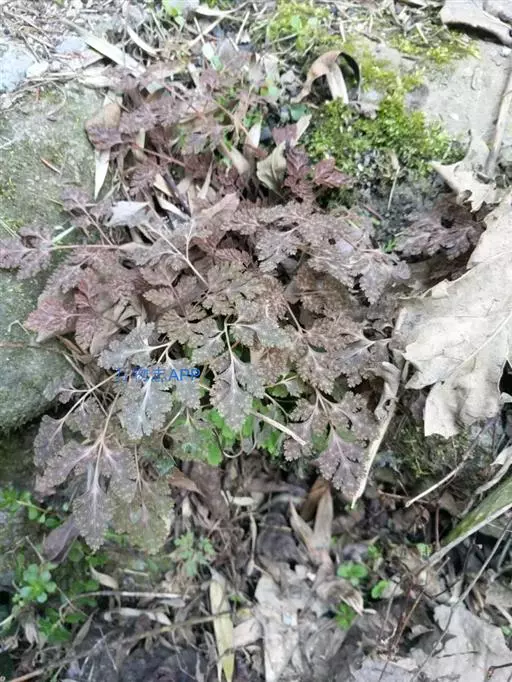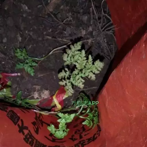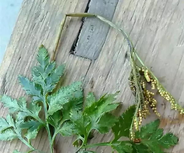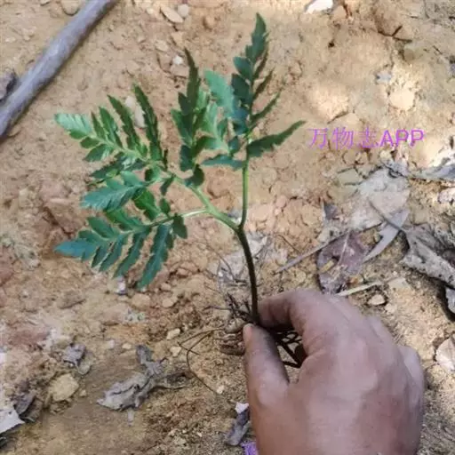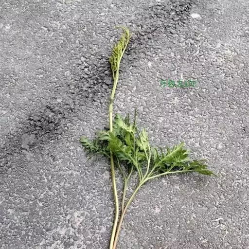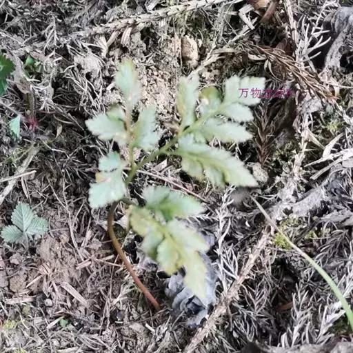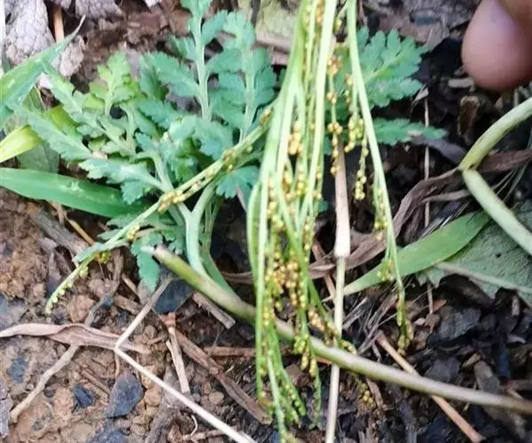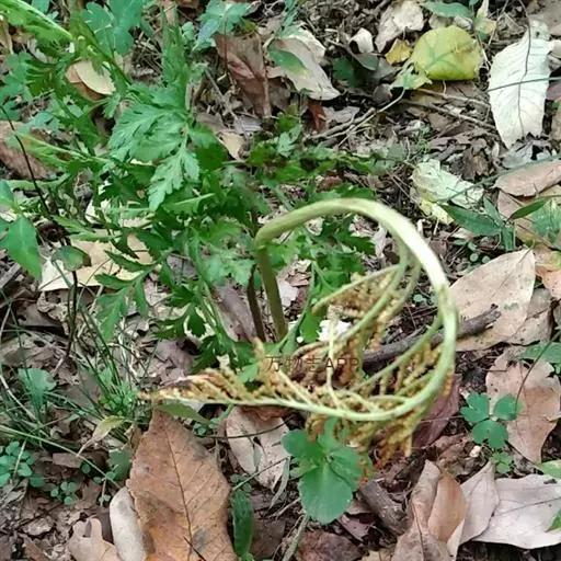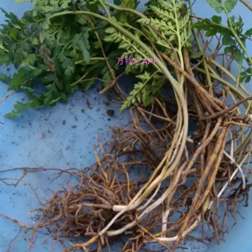 根茎长0.5-1cm,直径2-3.5mm,表面灰褐色,下部簇生数条须根。根长约5cm,直径2-3mm,常弯曲,表面黄褐色,具横向皱纹;质脆易断,断面白色,粉性。总叶柄长2-4cm,表面棕黄色,基部有干缩褐色的鞘;营养叶柄长3-8cm,直径1-2mm,三角状而扭曲,具纵条纹,淡红棕色;叶片卷缩,黄绿色或灰绿色,展开后呈阔三角形,三回羽裂,侧生羽片3-4对;叶脉不明显。孢子叶柄长12-25cm,黄绿色或淡红棕色;孢子囊穗棕黄色。气微,味微甘而微苦。