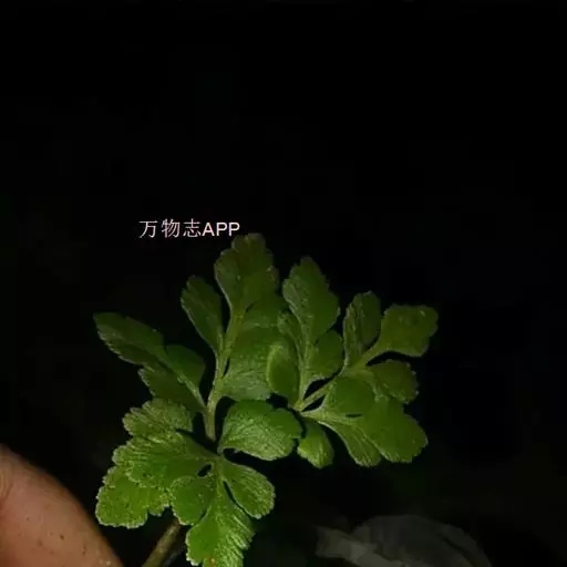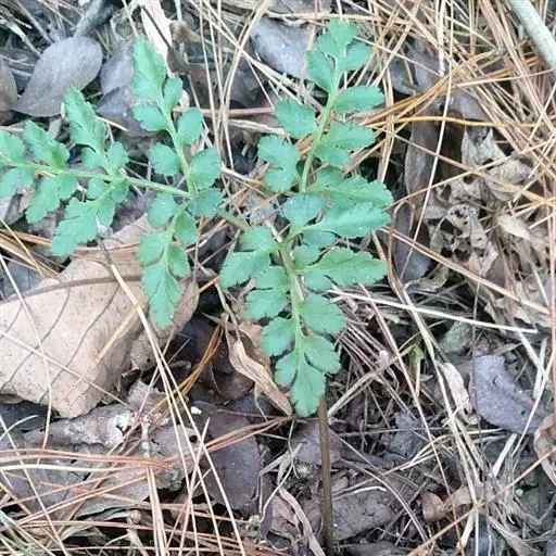 阴地蕨,又名花蕨。根状茎短而直立,有一簇粗健肉质的根。总叶柄短,长仅2-4厘米,细瘦,淡白色,干后扁平,宽约2毫米。营养叶片的柄细长达3-8厘米,有时更长,宽2-3毫米,光滑无毛;叶片为阔三角形,长通常8-10厘米,宽10-12厘米,短尖头,三回羽状分裂;侧生羽片3-4对,几对生或近互生,有柄,下部两对相距不及2厘米,略张开,基部一对最大,几与中部等大,柄长达2厘米,羽片长宽各约5厘米,阔三角形,短尖头,二回羽状;一回小羽片3-4对,有柄,几对生,基部下方一片较大,稍下先出,柄长约1厘米,一回羽状;末回小羽片为长卵形至卵形,基部下方一片较大,长1-1.2厘米,略浅裂,有短柄,其余较小,长约4-6毫米,边缘有不整齐的细而尖的锯齿密生。第二对起的羽片渐小,长圆状卵形,长约4厘米(包括柄长约5毫米),宽2.5厘米,下先出,短尖头。叶干后为绿色,厚草质,遍体无毛,表面皱凸不平。叶脉不见。孢子叶有长柄,长12-25厘米,少有更长者,远远超出营养叶之上,孢子囊穗为圆锥状,长4-10厘米,宽2-3厘米,2-3回羽状,小穗疏松,略张开,无毛。