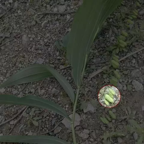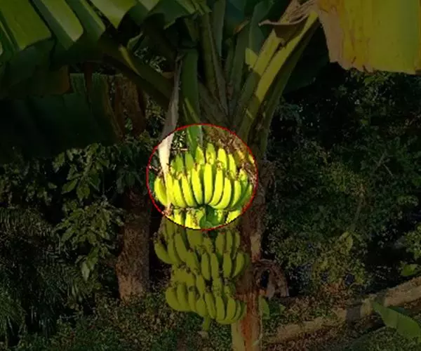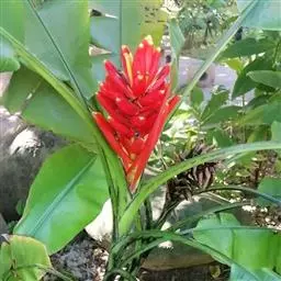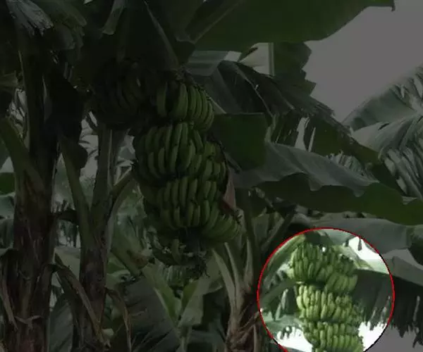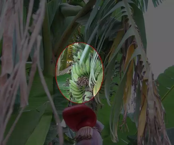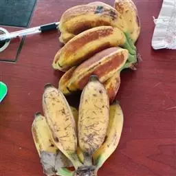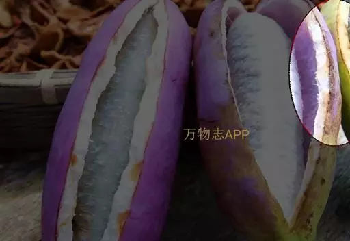 穗状花序下垂,花序轴无毛,苞片卵形或卵状披针形,长15-30厘米以上,脱落,外面呈紫红色,内面深红色,每苞片有花二列,雄花脱落。花被片黄白色,合生花被片长4-6.5厘米,离生花被片长约为合生花被片长之半,为透明蜡质,具光泽,长圆形或近圆形,先端具小突尖、锥尖或卷曲成一囊。果序由7-8段至数十段的果束组成。果长圆形,按长宽比例较短粗,果身直或微弯曲,长10-20厘米,棱角明显,果柄通常伸长,果肉细腻,紧实,未成熟前味涩,成熟时味甜或略带酸味,但缺香气或微具香气,无种子或具少数种子。剑头芽假茎红色,带有极多白粉而呈浅黄绿色。