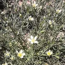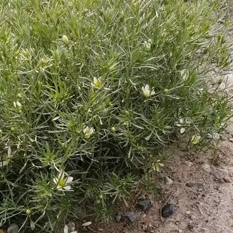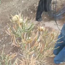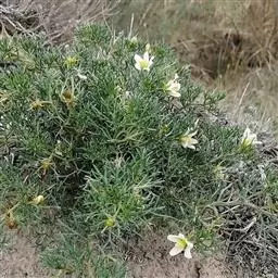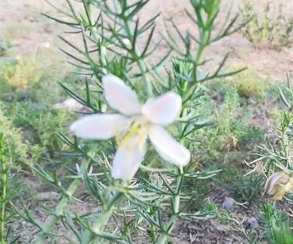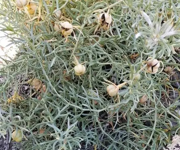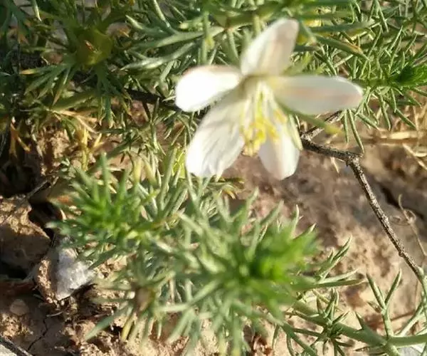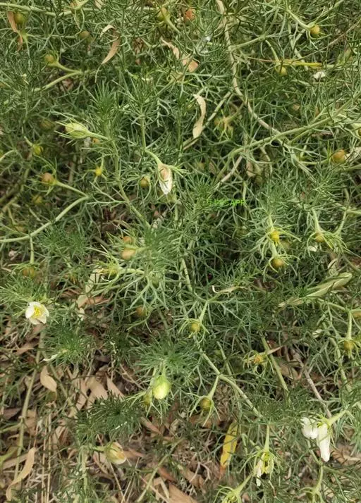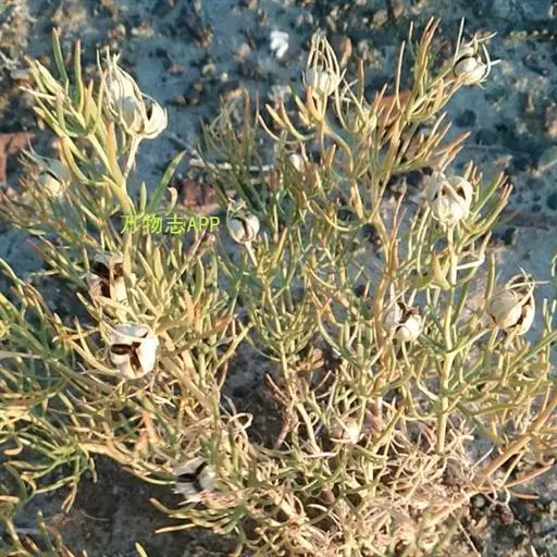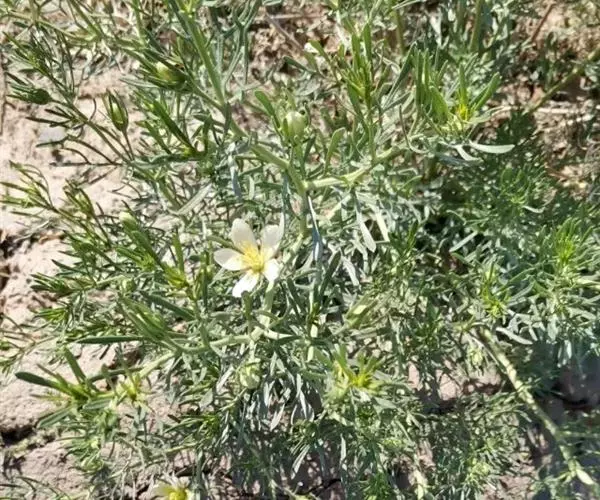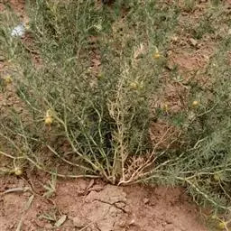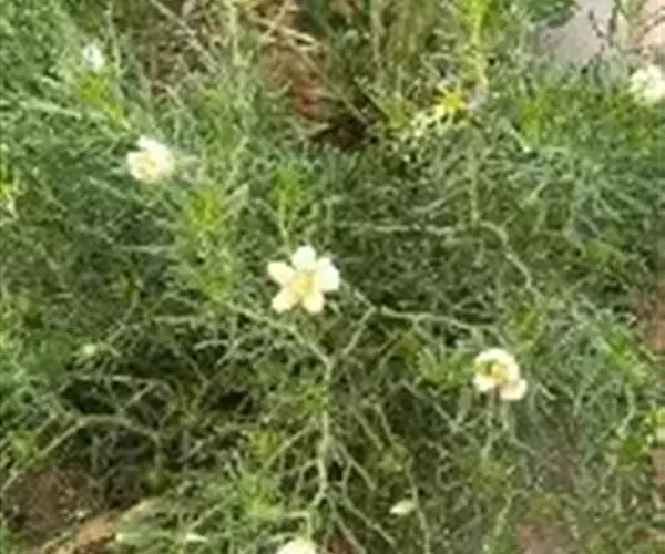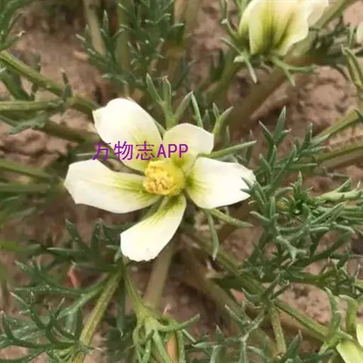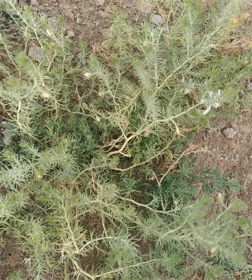 植物-骆驼蓬(图1) 多年生草本,高30-70厘米,无毛。根多数,粗达2厘米。茎直立或开展,由基部多分枝。叶互生,卵形,全裂为3-5条形或披针状条形裂片,裂片长1-3.5厘米,宽1.5-3毫米。花单生枝端,与叶对生;萼片5,裂片条形,长1.5-2厘米,有时仅顶端分裂;花瓣黄白色,倒卵状矩圆形,长1.5-2厘米,宽6-9毫米;雄蕊15,花丝近基部宽展;子房3室,花柱3。蒴果近球形,种子三棱形,稍弯,黑褐色、表面被小瘤状突起。骆驼蓬5月上旬返青,7~8月开花,9~10月种子成熟。