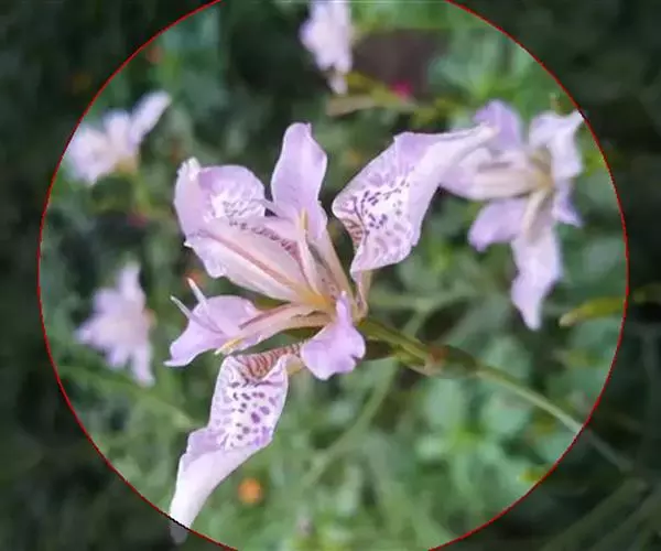花茎实心,高40-60厘米,上部二歧状分枝,分枝处生有披针形的茎生叶,下部有1-2枚抱茎的茎生叶,花序生于分枝顶端;苞片4-5枚,膜质,绿色,边缘白色,披针形,长1.5-2.3厘米,内包含有3-4朵花;花蓝紫色或浅蓝色,有棕褐色的斑纹,直径4-4.5厘米;花梗细,常超出苞片,长2-3.5厘米;花被管甚短,外花被裂片宽倒披针形,长3-3.5厘米,宽约1厘米,上部向外反折,无附属物,内花被裂片狭倒卵形,长约2.5厘米,宽6-8毫米,顶端微凹;雄蕊长1.6-1.8厘米,花药与花丝等长;花柱分枝扁平,花瓣状,长约2.5厘米,顶端裂片狭三角形,子房绿色,长约1厘米。