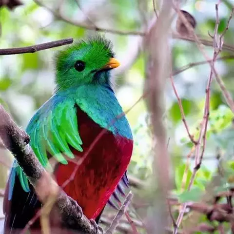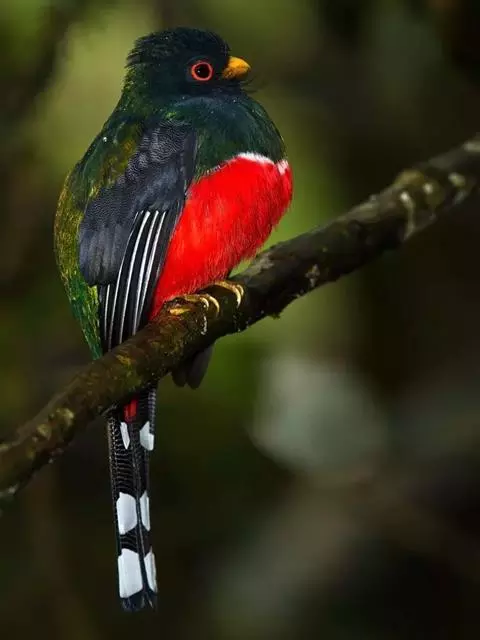 橙胸咬鹃:全长约28厘米。雄鸟头、颈橄榄绿色,上体及中央尾羽栗色;中央尾羽具黑色端,…