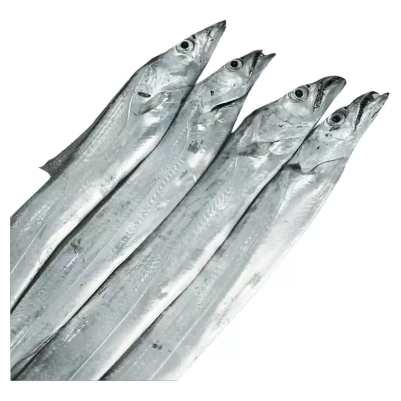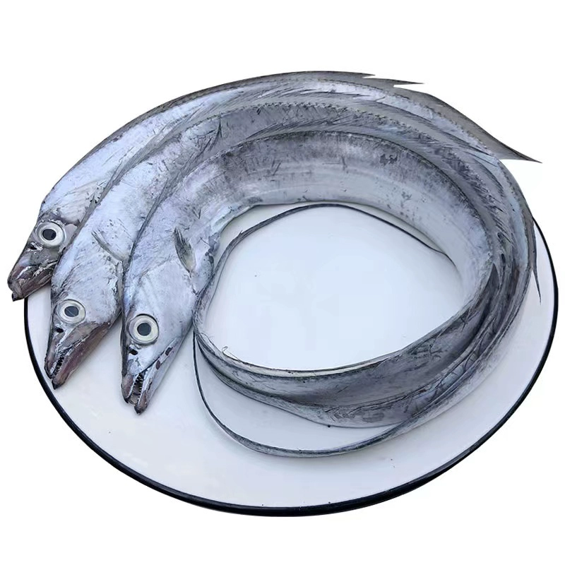 带鱼,体带状,侧扁。前部背腹缘几平行,体长一般50-70cm,大者长达120cm。头狭长,尖突吻尖长。眼中大,位高,眼间隔平坦,中央微凸。口大;平直,口裂后缘达眼下方。下颌长于上颌,突出。牙强大,侧扁而尖,两颌前端各有2对倒钩状大犬牙,上颌具侧牙10-13颗;下颌具侧牙12-14颗。鳃孔宽大,鳃耙(8-14)+(15-24),细短。体表银灰色,无鳞,但表面有一层银粉,侧线在胸鳍上方向后显著弯下沿腹线直达尾端。 体光滑,鳞退化为银膜。侧线于胸鳍上方显著下弯,沿腹缘伸达尾端。背鳍1285-145,起点在头后部,延达尾端。臀鳍88-13-13,完全由分离小棘组成,仅棘尖外露,第1鳍棘甚小。胸鳍11-12,短尖而低。无腹鳍。尾鞭状,尾鳍消失。体银白色,背鳍上关部及胸鳍浅灰色,具细小黑点。尾暗黑色。脂肪较多且集中于体外层。