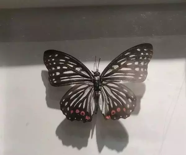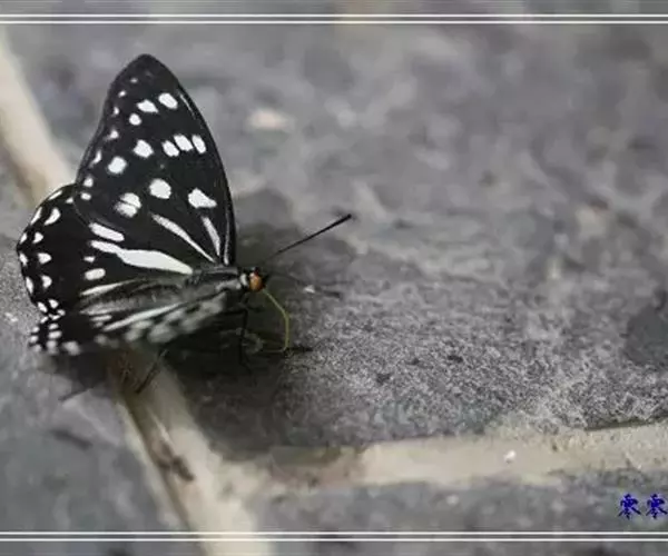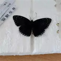 翅面黑色,有许多不规则尖形白斑,前翅中室内白斑分开,有二中列、一亚缘列白斑,后缘一室有二平行白条纹,后翅基半部脉间白色,端部有亚缘及缘小白斑列。翅反面似正面,但前翅顶角、后半部及后翅端区呈深褐色。