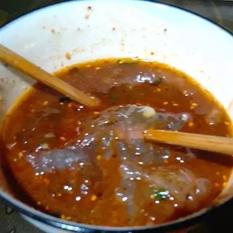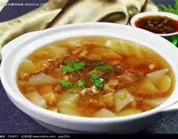 2.取适量土豆粉用水稀释成土豆粉汁后,用锅煎成薄饼、切片,可以下火锅与鸡或猪蹄炖食,也可以和豆腐皮一起煮,还可与回锅肉混炒,是一道难得的餐桌佳肴。