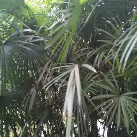 细叶棕竹,灌木,茎细如竹,多数聚生,有网状叶鞘。叶半圆形,掌状深裂,裂片狭长,阔线形,软垂,裂片7…