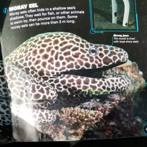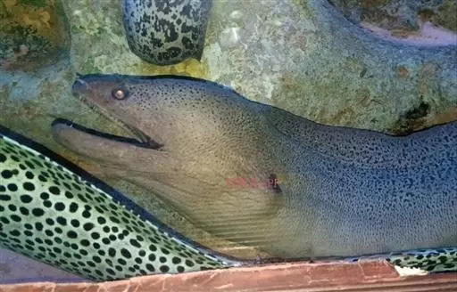海鳗体呈长圆筒形,尾部侧扁。尾长大于头和躯干长度之和。头尖 海鳗 长。 眼椭圆形。口大, 舌附于口底。上颌牙强大锐利,3行; 犁骨中间具10~15个侧扁大牙。体无鳞,具侧线孔140~153个。背鳍和臀鳍与尾鳍相连。体黄褐色, 大型个体沿背鳍基部两侧各具1暗褐色条纹。脊椎骨142~154个。 摄食强度以7~9月较高。海鳗有明显洄游现象。