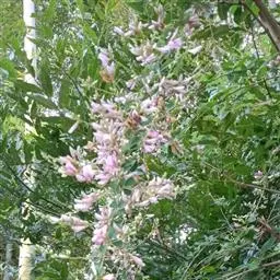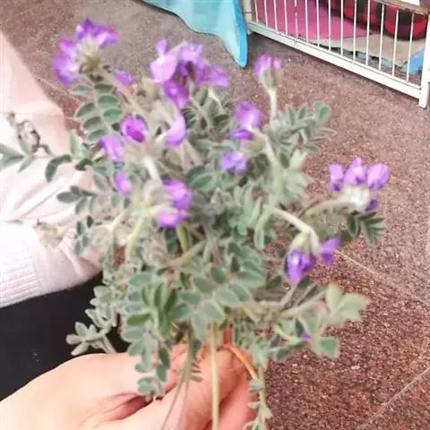 总状花序直立,长15-25厘米,花序轴粗壮,总花梗长8-14厘米;小苞片2,近圆形,长3毫米,脱落;花2至多朵簇生于每一节上;花萼钟状,长约6毫米,上方2裂齿几完全合生,下方的3枚近相等;花冠白色或紫色,旗瓣圆形,基部两侧具2枚长而直立的小附属体,附属体下有2耳,翼瓣宽倒卵形,具截平的耳,龙骨瓣呈直角弯曲,基部渐狭成瓣柄;子房线形,无毛,花柱比子房长,弯曲不逾90°,一侧扁平,近顶部内缘被毛。