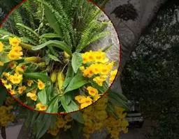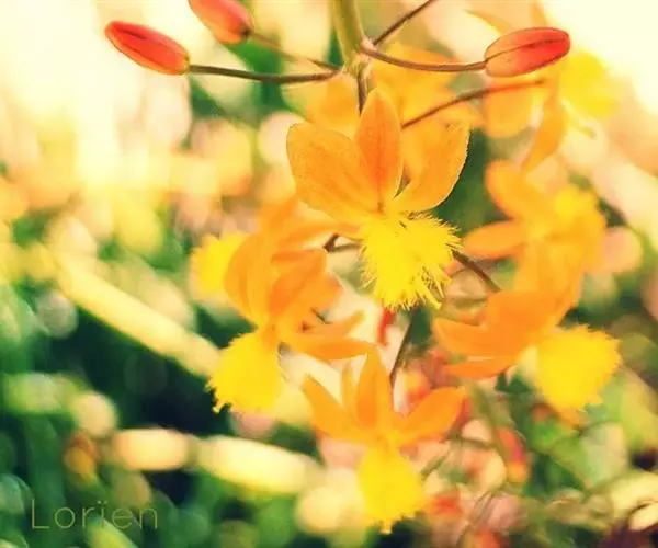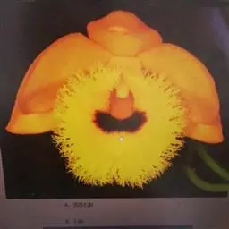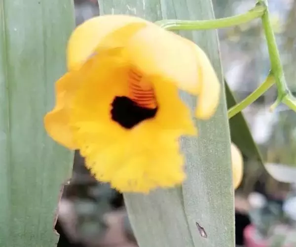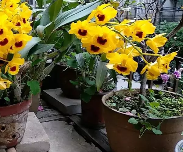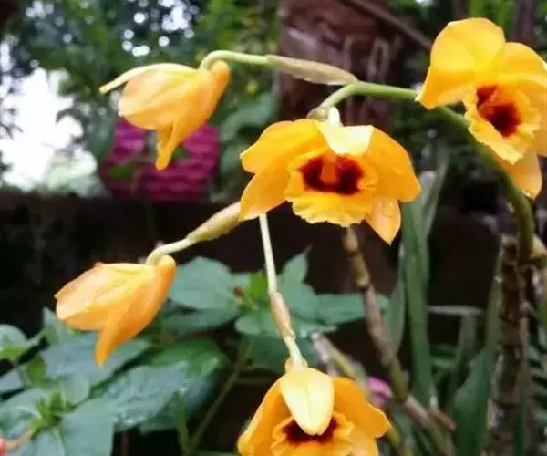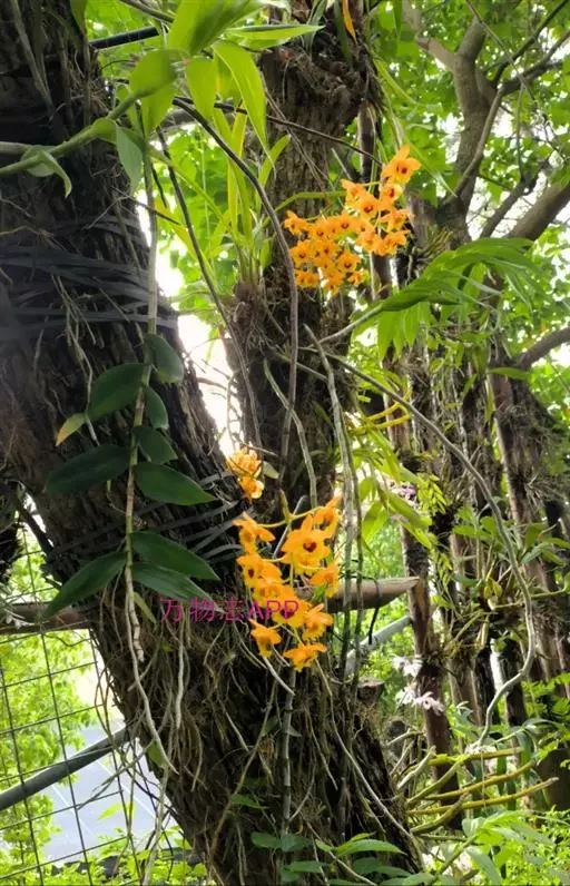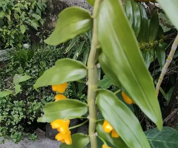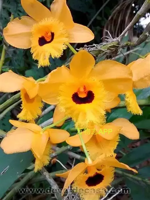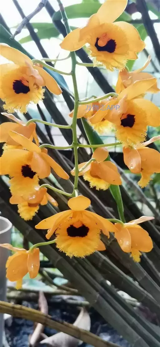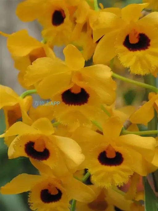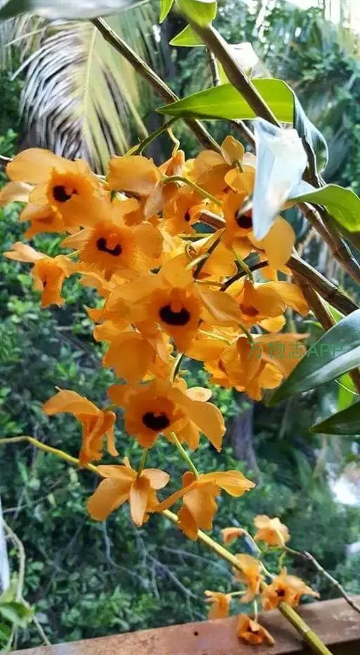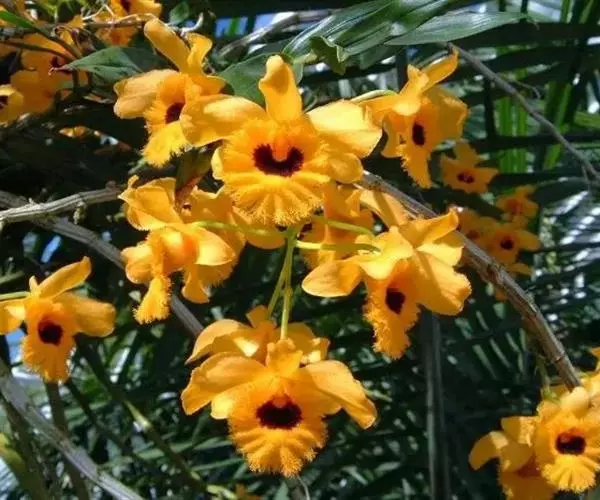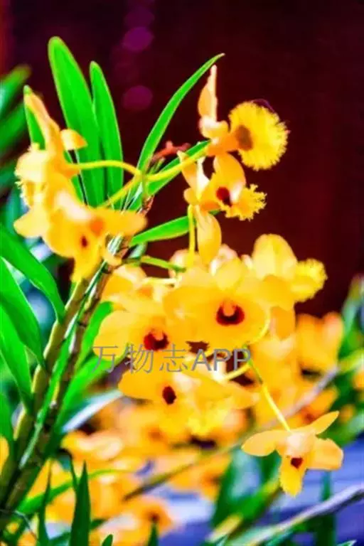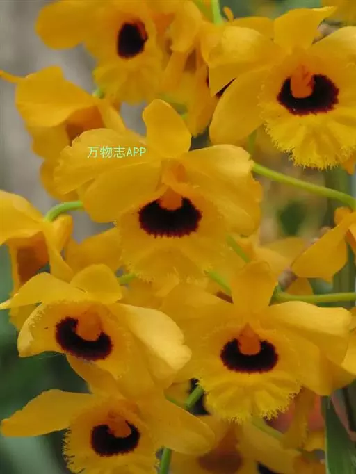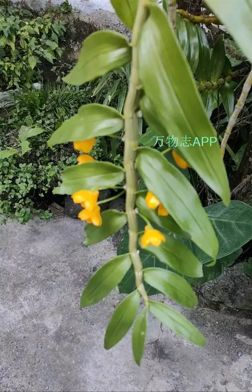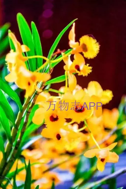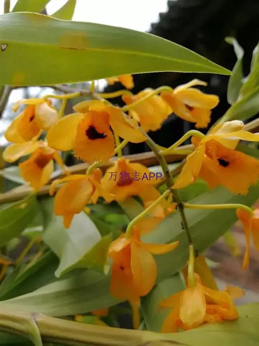 流苏石斛(学名:Dendrobium fimbriatum Hook.):茎粗壮,斜立或下垂,质地硬,圆柱形或有时基部上方稍呈纺锤形,不分枝,具多数节。叶二列,革质,长圆形或长圆状披针形。总状花序长5-15厘米,疏生6-12朵花;花金黄色,质地薄,开展,稍具香气;花瓣长圆状椭圆形,长1.2-1.9厘米,宽7-10毫米,先端钝,边缘微啮蚀状,具5条脉;唇瓣比萼片和花瓣的颜色深,近圆形,长15-20毫米,基部两侧具紫红色条纹并且收狭为长约3毫米的爪,边缘具复流苏。花期4-6月。