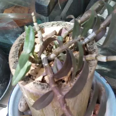 短棒石斛:茎肉质状,近扁的纺锤形,不分枝,具多数钝的纵条棱和少数节间。叶2-4枚近茎端着生,革质,…