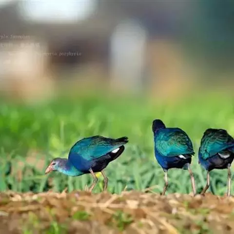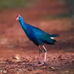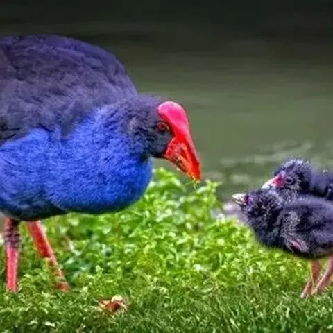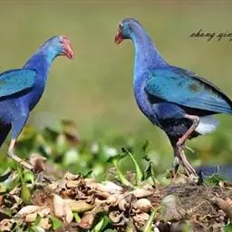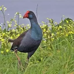 紫水鸡 紫水鸡,体大(42厘米)而壮,紫蓝色,红色的嘴特形大,除尾下覆羽为白色外,整个体羽蓝黑色并具紫色及绿色闪光。具一红色的额甲。 虹膜红色;嘴红色;脚红色。咕咕咯咯叫个不停;另有带鼻音的号角声wak。分布于古北界至非洲、东亚地区、澳大利亚及大洋洲。亚种poliocephalus为云南西南部的罕见繁殖鸟,可能在西藏极东南部也有分布。云南西部、广西及香港有迷鸟越冬记录。栖于多芦苇的沼泽地及湖泊,在水上漂浮植物及芦苇地中行走。有时结小群到漫水的开阔草地、稻田或火烧过后的草地上活动。尾上下抽动。