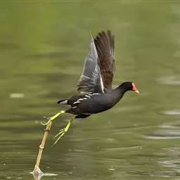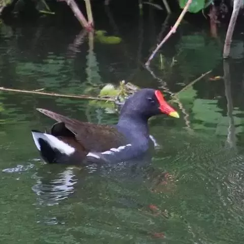 红冠水鸡 红冠水鸡,全身黑色,体型圆胖的秧鸡科鸟类了。嘴基部及前额呈红色,双脚为黄绿色,嘴尖黄色;在它们的臀部两侧,有大型的白色斑块,它们就是台湾湿地常见的红冠水鸡。红冠水鸡是普遍的留鸟,活动以鱼塭、水田及红树林等大面积的湿地或水塘,虽然外表和不会游泳的鸡非常相像,但可是游泳高手。在游动时,红冠水鸡的头部会不停的地向前伸展,而白白的尾部也会规律地摆动,看起来,就好像是只游在水面的黑水鸭子。通常单独或成对活动,繁殖后期。常见组成小家族群。喜在茂密的水草丛中穿梭。飞不高,少飞翔。活动于消晨和黄昏,以水生小动物、昆虫、植物种子为食。