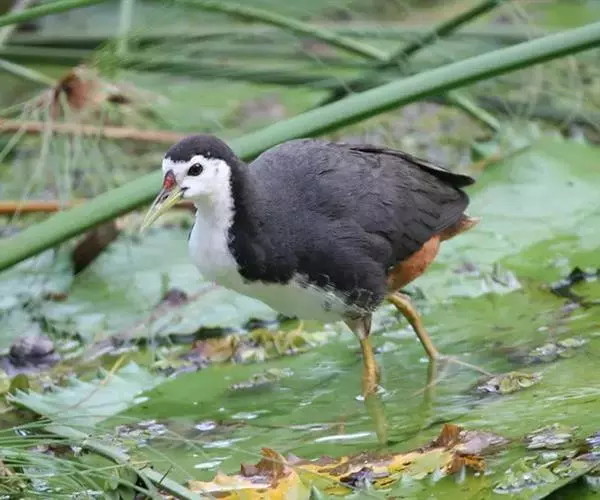 苦恶鸟(图3) 苦恶鸟是鹤形目秧鸡科的1属。体长270~300毫米,体重200~300克。上体近灰黑色,面部和下体纯白,尾下覆羽呈栗色;嘴基稍隆起,但不形成额甲,嘴峰较趾□为短;跗较中趾(连爪)为短;翅短圆,不善长距离飞行。共有5种,主要分布于东半球的热带和亚热带。中国有 2种。本属以白胸苦恶鸟为典型代表。