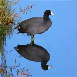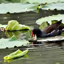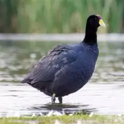 乌水鸡 乌水鸡是一种体型较大的水鸡,身体乌黑色,与我国的黑水鸡比较相似,但体型较大,大小与白骨顶相当,两胁没有白色细纹,腿红色。与白骨顶也比较相似,并可能混群在一起,但可以从嘴、骨顶和腿的颜色将二者区分开。叫声急促重复的“krurk”声。乌水鸡和黑水鸡几乎是镶嵌分布,黑水鸡几乎遍布世界各地,唯独不产于大洋洲,而乌水鸡则是大洋洲的土产。乌水鸡在澳大利亚东南部和西南部比较常见,在澳大利亚北部则比较罕见。乌水鸡出没于各种不同的湿地环境中,最喜欢边缘有茂密植物的开阔淡水水域,在城市公园的水塘中也能见到。繁殖通常在南部繁殖于9~11月,北部繁殖于1~4月。在芦苇或近水的植物中筑不很隐蔽的巢,产卵4~10枚。