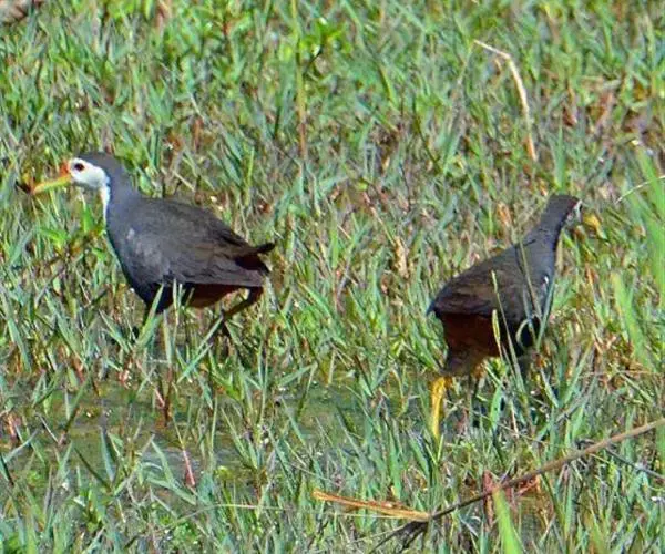 苦恶鸟(图4) 白胸苦恶鸟又名白胸秧鸡或白面鸡,善奔走,在芦苇或水草丛中潜行,亦稍能游泳,偶作短距离飞翔,以昆虫、小型水生动物以及植物种子为食。在繁殖期间雄鸟晨昏激烈鸣叫,音似“kue,kue,kue”,故称“姑恶鸟”或“苦恶鸟”。在荆棘或密草丛中,偶亦能在树上,以细枝、水草和竹叶等编成简陋的盘状巢。每窝产卵6~9枚。卵土黄色,上布紫褐色和红棕色的稀疏纵纹和斑点。在中国南方每年可产2~3窝。雏鸟为早成性,孵出后即能离巢,但仍与亲鸟一起活动。白胸苦恶鸟的普通亚种夏季在中国长江流域以南的东部地区繁殖,偶见于河北省和山东省。在福建、广东、台湾、云南各省为留鸟。肉味鲜美,为猎禽之一。