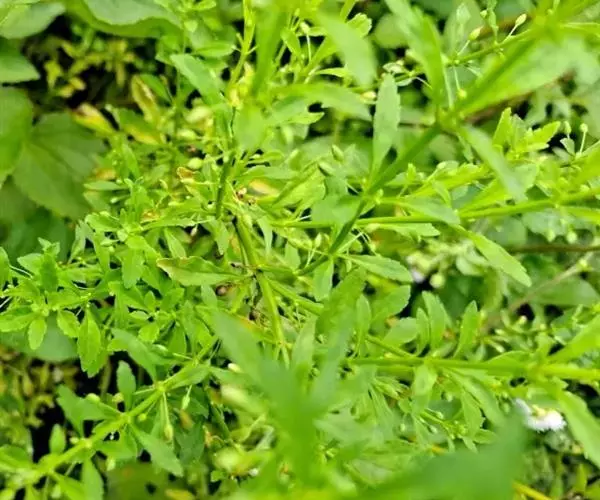 野甘草 亚灌木,高25~80厘米,全株无毛。根粗壮。茎直立,有分枝,下部木质化。叶小,对生及轮生,披针形至椭圆形或倒卵形,长5~20毫米,先端短尖,基部渐狭而成一短柄,边缘有锯齿。花小,多数,白色,单生或成对;萼片4,卵状矩圆形,长约2毫米;花冠辐状,4裂,裂片椭圆形,花径4~5毫米,喉部有毛;雄蕊4,花药箭头形,黄绿色;雌蕊1,花柱细长,柱头盘状。蒴果卵状至球形,直径2~3毫米,花柱宿存,熟后开裂。花期夏、秋间。