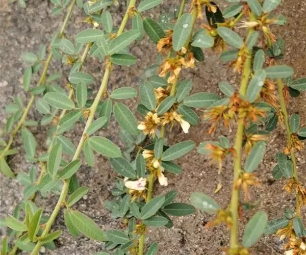 荚果斜倒卵形,稍扁,长约10毫米,宽约5毫米,表面具网纹,密被短柔毛。花期7-9月,果期9-10月。