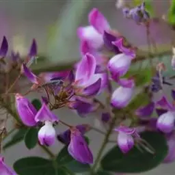 总状花序腋生,比叶长,常构成大型、较疏松的圆锥花序;总花梗长4-10厘米;小苞片2,卵形,长不到1厘米,先端钝圆或稍尖,黄褐色,被短柔毛;花梗短,长约2毫米,密被毛;花萼长约5毫米,5浅裂,裂片通常短于萼筒,上方2裂片合生成2齿,裂片卵形或三角状卵形,先端尖,外面被白毛;花冠红紫色,极稀白色(var.albaBean),长约10毫米,旗瓣倒卵形,先端微凹,翼瓣较短,近长圆形,基部具耳和瓣柄,龙骨瓣与旗瓣近等长,先端钝,基部具较长的瓣柄;子房被毛。