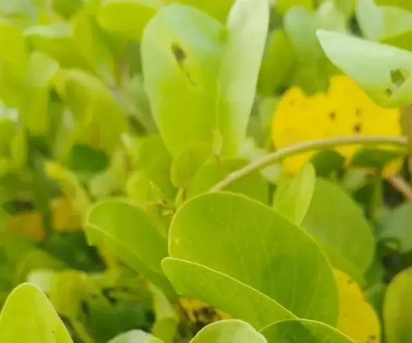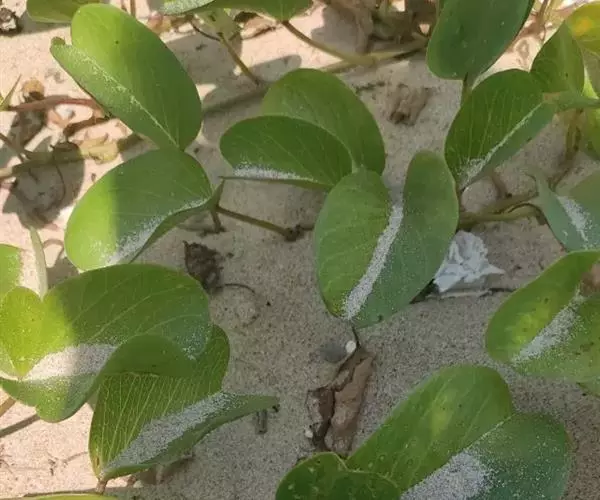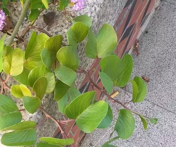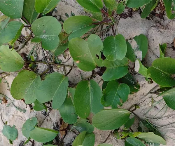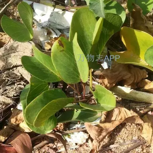 厚藤为多年生草本,全株光滑;茎极长而匍匐地面;叶互生,厚革质,形如马鞍。
