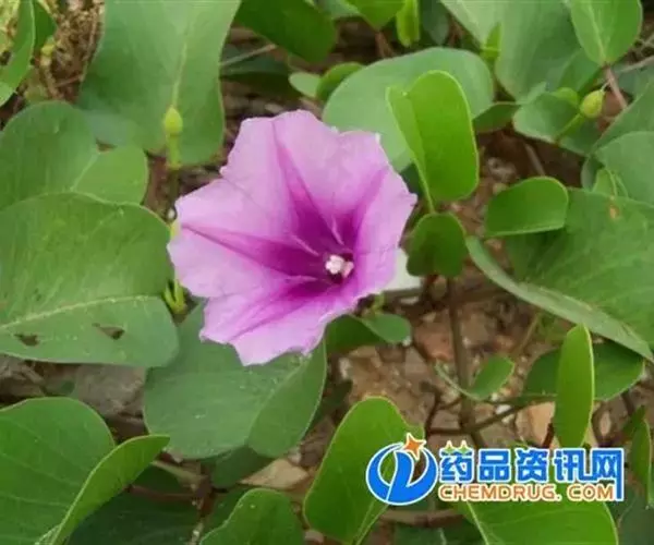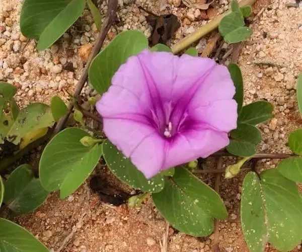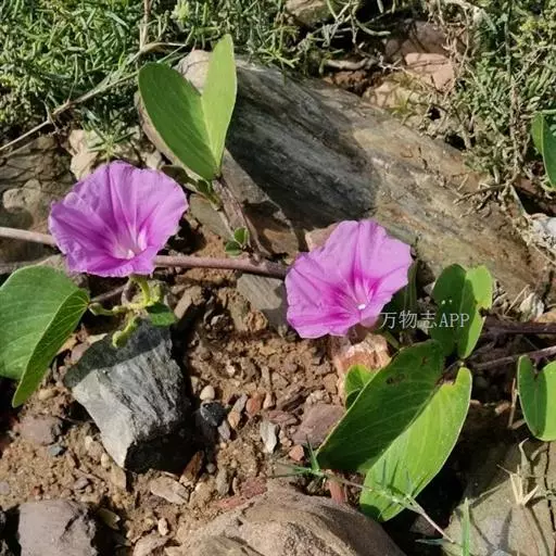 甘薯属 Ipomoea多年生常绿匍匐草本植物,茎紫红色,基部木质化,节上生不定根。叶互生,叶片厚纸质,宽椭圆形或近圆形,或肾形,长3~7厘米,宽2~6厘米,先断微凹或2裂,裂片圆,基部宽楔形、截形至浅心形,下面中脉近基部两侧各有一枚腺体,侧脉8~10对;叶柄长2~10厘米。多歧聚伞花序腋生,有数朵花,有时仅一朵发育;总花梗粗壮,长3.5~8厘米;花梗长1.5~3厘米;苞片小,宽卵形,早落;萼片厚纸质,卵形,外萼片长7~9毫米,内萼片长8~10毫米,先断圆盾,具小尖头;花冠白色或紫红色,漏斗状,长4.5~5厘米;雄蕊不等长,内藏;子房四室。蒴果卵圆形,径约1.5~2厘米,四瓣裂。种子径约7毫米,密被褐色茸毛。花果期5~10月。