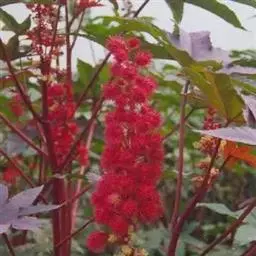 雄花;总花梗长7-10厘米;穗状花序卵状圆锥形,花期艳丽,红色,长4-5厘米,宽1.5-2厘米;萼管长2-3毫米,雄蕊排成2轮,偶有3轮,极少排成1轮者,药隔与花丝连合成一柱状体,此柱头体红色,在花序下部的长10-12毫米,在花序上部的较短,长4-6毫米。雌花:花梗长10-17毫米,于果期延长可达6厘米;萼管长4-6毫米;子房全部被包藏于萼管内,其与花柱共长达3-5厘米;柱头11-15,紫黑色,开展,放射状,直径1.5-2.5厘米。蒴果扁圆盒状,倒垂,长4-5厘米,直径8-9厘米,顶端和基部均凹陷。花期5月。