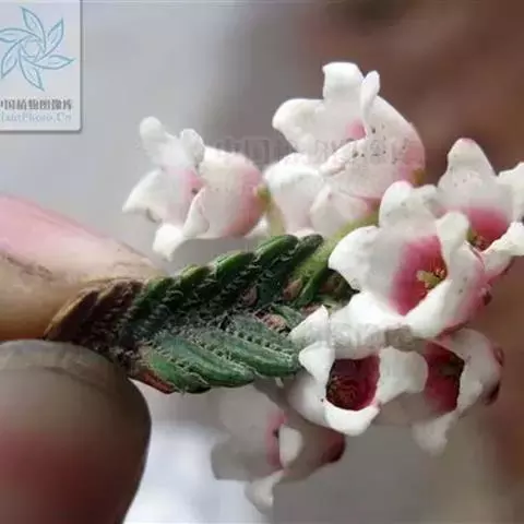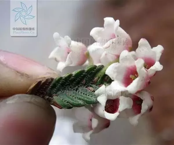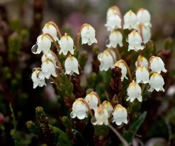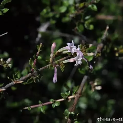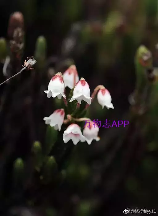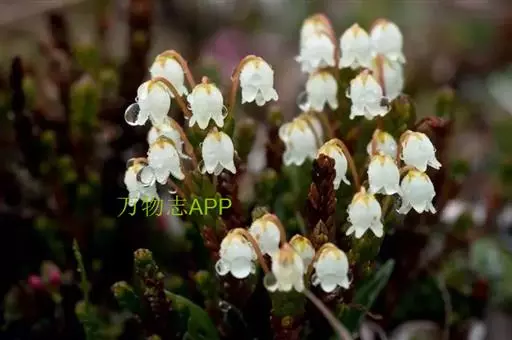 常绿矮小半灌木,高5-25厘米;枝条多而密,外倾上升或铺散成垫状,小枝长5-7厘米,直径2-2.4毫米,无毛,密生交互对生的叶。叶硬革质,披针形至披针状长圆形,长2-3毫米,宽(0.7-)1-1.7毫米,基部稍宽,2裂叉开,顶端稍钝,幼时具1长达0.75毫米的紫红色芒刺,背面龙骨状隆起,有1深纵沟槽,向上几达叶顶端,背面有光泽,无毛,腹面近凹陷,被微毛,边缘被纤毛,以后变无毛,留下疏齿状的残余或全缘。花单朵腋生;花梗长1.5-2.2厘米,有时更短,被蛛丝状长柔毛,顶部下弯,花下垂,基部为苞片所包围;花萼5,绿色或紫红色,裂片卵状披针形或披针形,长2.5-3毫米,无毛;花冠乳白色,宽钟状,长7-10毫米,两面无毛,口部5浅裂,裂片宽三角形;雄蕊10枚,较花冠短,花丝长5-7毫米,被柔毛。蒴果球形,直径5-8毫米,无毛,花柱宿存。花期4-5月,果期6-7月。 [1-2]