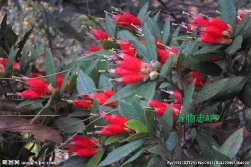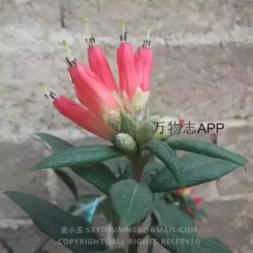 花序伞形,有2-4花;花梗长0.2-1厘米,连同花萼密被灰白色柔毛和鳞片;花萼浅杯状,无裂片;花冠筒状,两端略狭缩,长1.5-2.5厘米,朱红色、鲜红色或橙红色,上部5裂,裂片卵形,直立,花冠外面洁净,稀于裂片中部至筒部条状被短柔毛;雄蕊10,不等长,略伸出花冠之外,花药紫黑色,花丝无毛,稀基部有短柔毛;子房5室,密被茸毛并覆有鳞片,花柱长伸出花冠之外,无毛稀基部被短柔毛。