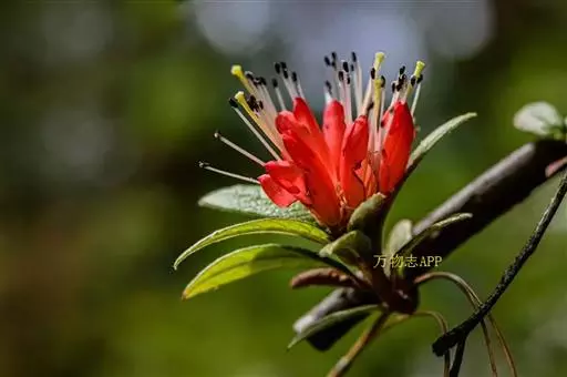 爆杖花(学名:Rhododendron spinuliferum Franch.):灌木,高0.5-3.5米。幼枝被灰色短柔毛,杂生长刚毛,老枝褐红色,近无毛。叶坚纸质,散生,叶片倒卵形、椭圆形、椭圆状披针形或披针形,。花序腋生枝顶成假顶生;花冠筒状,两端略狭缩,长1.5-2.5厘米,朱红色、鲜红色或橙红色,上部5裂,裂片卵形,直立。蒴果长圆形,长1-1.4厘米,被疏茸毛并可见鳞片。花期2-6月。