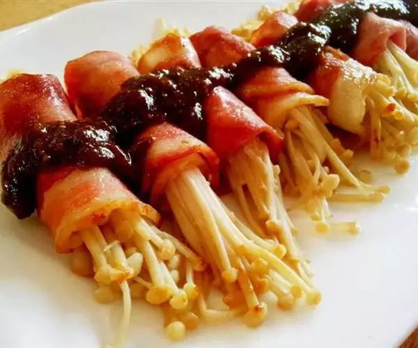 5、每片培根卷鼓鼓的卷进炒好的金针菇,用牙签固定。