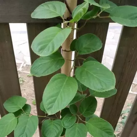 硬齿猕猴桃为大型落叶藤本;小枝较坚硬,干后土黄色,洁净无毛;叶卵形或卵状椭圆形至倒卵形,长8-10厘米,宽4-5.5厘米,边缘锯齿细小,背面脉腋上有髯毛;