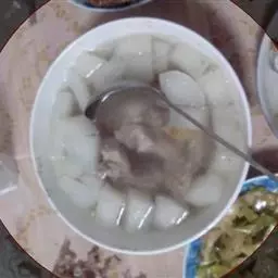 排骨汤,是用猪、牛、羊等动物剔肉后剩下的肋骨和脊椎骨制作的一道家常汤品。排骨除含蛋白、脂肪、维生素外,还含有大量磷酸钙、骨胶原、骨粘蛋白等,可为幼儿和老人提供钙质。