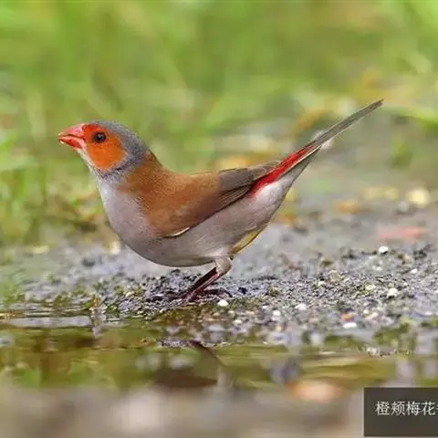 橙颊梅花雀体长约10厘米,头部灰色,两侧有大块橙色区域,嘴基及眼下方有黑纹,两条黑纹间呈白色,…