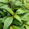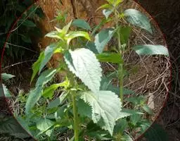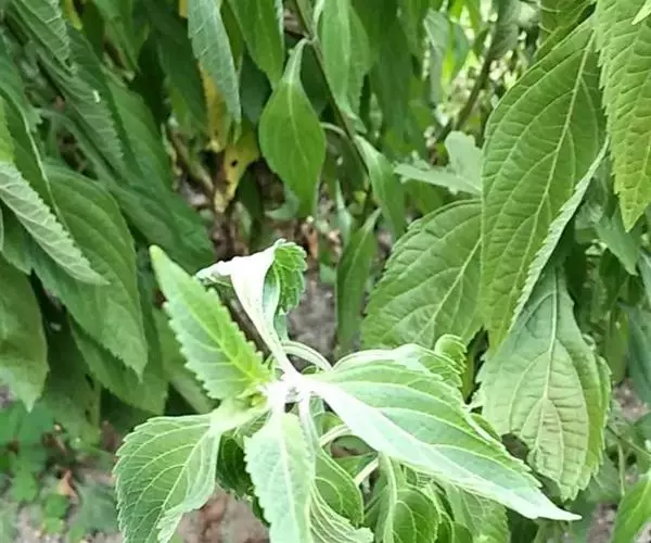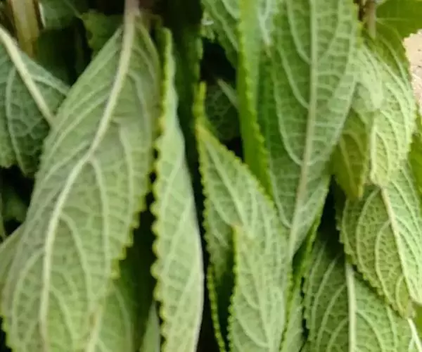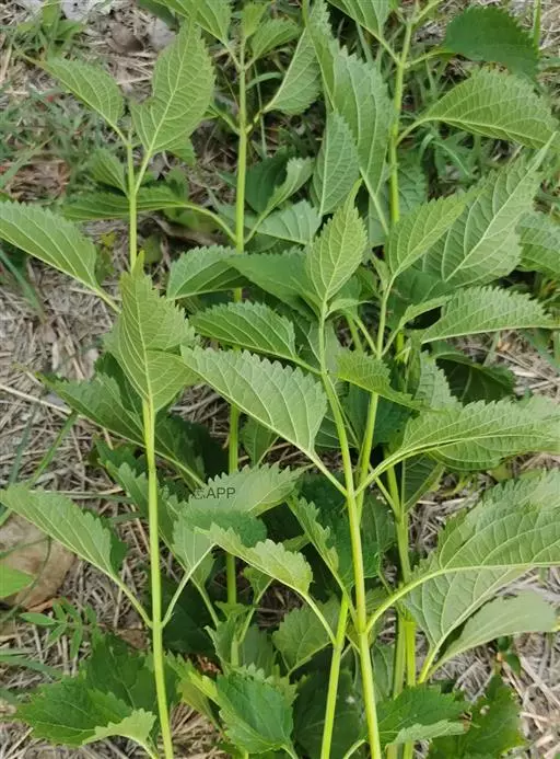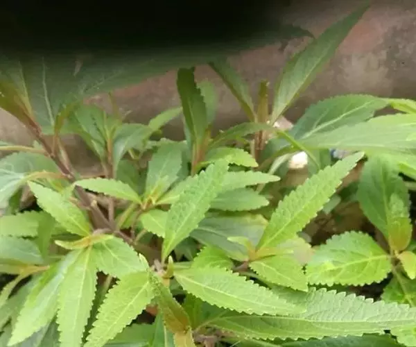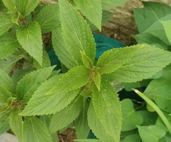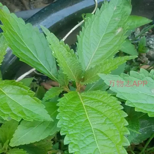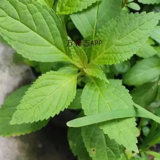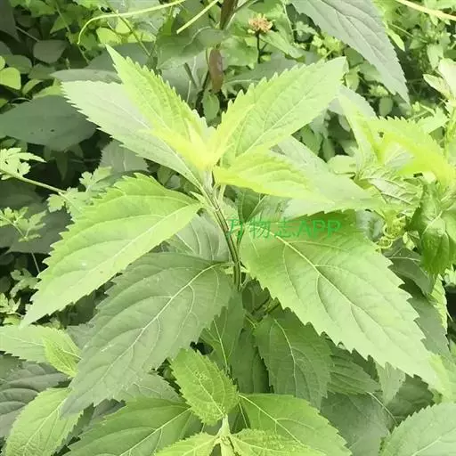 茎叶对生,卵圆形或卵圆状披针形或披针形,长3.5-10厘米,宽1.5-4.5厘米,先端近渐尖,基部楔形,边缘具粗大内弯的锯齿,草质,上面暗绿色,下面淡绿色,两面仅脉.上密被微柔毛,余部无毛,散布淡黄色腺点,侧脉每侧4-55与中脉在两面微隆起,在边缘之内网结,其间平行细脉多少明显;叶柄长0.5-3.5厘米,上部具渐宽大的翅,腹凹背凸,密被微柔毛。