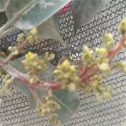圆锥花序长15-30厘米,与叶近等长,被灰黄色微柔毛,序轴及分枝纤细,疏花;花黄绿色,雄花花梗纤细,长1-3毫米,雌花花梗短粗;花萼无毛,裂片卵形,长约0.8毫米,先端钝;花瓣长圆形,长约2.5毫米,宽约1.2毫米,具细密的褐色羽状脉纹,先端钝,开花时外卷;雄蕊长约2.5毫米,花丝线形,与花药等长或近等长,在雌花中较短,花药长圆形,花盘5浅裂,无毛;子房球形,径约1.5毫米,花柱3。