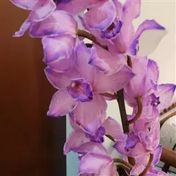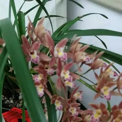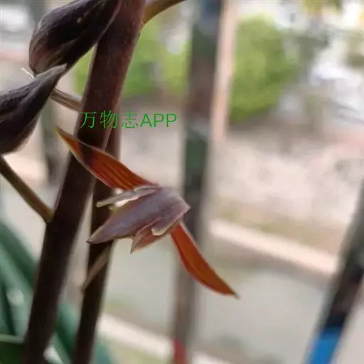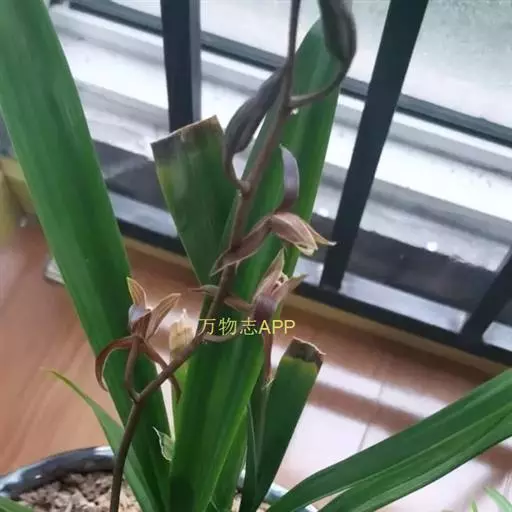 花葶从假鳞茎基部发出,直立,较粗壮,长(40-)50-90厘米,一般略长于叶。总状花序具10-20朵或更多的花;花苞片除最下面的1枚长于1厘米外,其余的长4-8毫米;花梗和子房长2-2.5厘米;花的色泽变化较大,较常为暗紫色或紫褐色而具浅色唇瓣,也有黄绿色、桃红色或白色的,一般有较浓的香气;萼片狭长圆形或狭椭圆形,长2. 2-3 (-3.5)厘米,宽5-7毫米;花瓣近狭卵形,长2-2. 7厘米,宽6-10毫米;唇瓣近卵状长圆形,宽1.7-2.5(-3)厘米,不明显3裂;侧裂片直立,多少围抱蕊柱,具乳突状短柔毛;中裂片较大,外弯,亦有类似的乳突状短柔毛,边缘略波状;唇盘上2条纵褶片从基部延伸至中裂片基部,上半部向内倾斜并靠合,形成短管;蕊柱长1.2-1.5厘米,稍向前弯曲,两侧有狭翅;花粉团4个,成2对,宽卵形。花期10月至次年3月。蒴果狭椭圆形,长6-7厘米,宽1.5-2厘米。