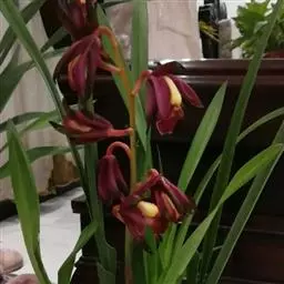 墨兰(学名:Cymbidium sinense (Jackson ex Andr.)Willd.):又名报岁兰,是兰科兰属地生植物。假鳞茎卵球形,包藏于叶基之内。叶带形,近薄革质,暗绿色。花葶从假鳞茎基部发出,直立,较粗壮,一般略长于叶;花的色泽变化较大,较常为暗紫色或紫褐色而具浅色唇瓣,也有黄绿色、桃红色或白色的,一般有较浓的香气;萼片狭长圆形或狭椭圆形;花瓣近狭卵形;唇瓣近卵状长圆形;蕊柱稍向前弯曲,两侧有狭翅;花粉团4个,成2对,宽卵形。蒴果狭椭圆形。花期10月至次年3月。