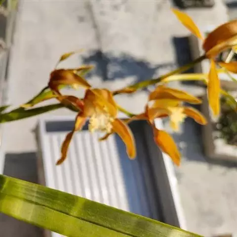 叶3-5枚,丛生在椭圆形的假鳞茎上,叶片剑形,深绿色,叶片尖端有金色嘴艺,因而称为“金嘴”。花茎直立,高出叶面,花香,每支花有7-17朵。