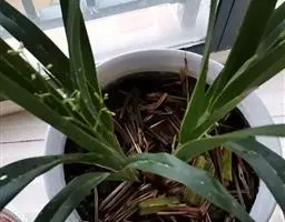 分盆时,首先用左手五指抓住兰苗的基部,将盆倒置过来,并轻轻叩击盆的周围,使盆与盆土分离,再细心将土坨轻轻拍打抖落泥土。小心清理兰根,剪去腐烂根、断根、枯叶及干枯的假鳞茎,然后用清水冲洗干净,将兰根放入托布津1000倍液或高锰酸钾800倍液中进行消毒。杀灭伤口附近的病菌。