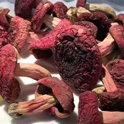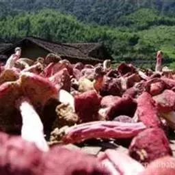 (2)加工干制目前红菇产区群众多采用烘干,目前采用晒干制法大多被淘汰。由于红菇营养丰富,又是野生土生菌,且又发生在高温暑期,腐烂和虫蛀成为影响其商品价值的最大限制因子。日晒一般要2-3天,有相当多成熟度高的红菇,在晒制过程中内部已开始虫蛀。阴雨天采收的,第二天内部就开始生蛆,在产品收购中被淘汰。因此,红菇采收后要立即采用脱水烘干机械干制,提高产品质量和经济效益。
