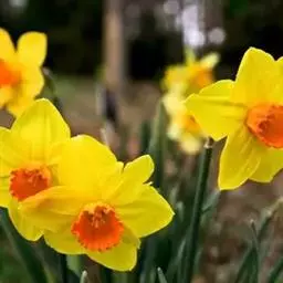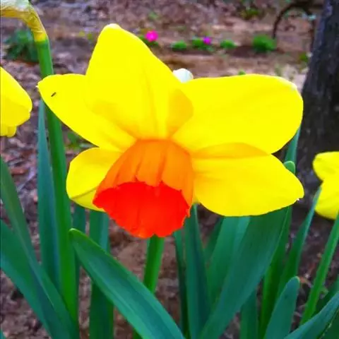 洋水仙 花茎短,花被片金黄色,副冠橘红色。