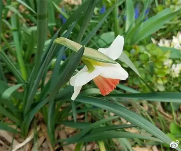 原产法国、希腊至地中海沿岸。鳞茎较小,叶宽线形,粉绿色。花茎花葶与叶等长或略高。顶生一花。花被片纯白,副花冠浅杯状,边缘红色,颇为娇艳,有芳香。花期4月。休眠期很短,宜早栽种。
