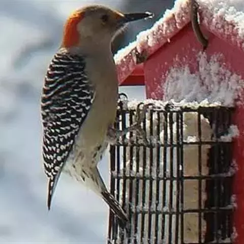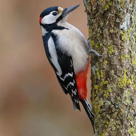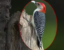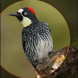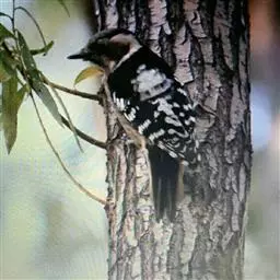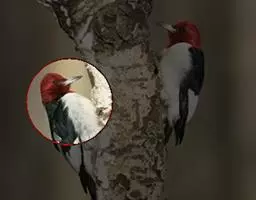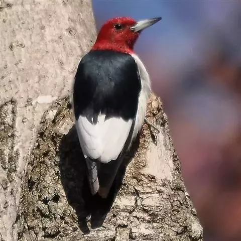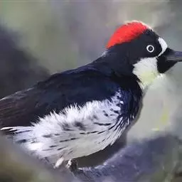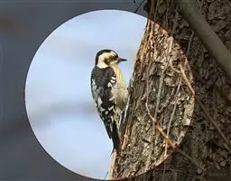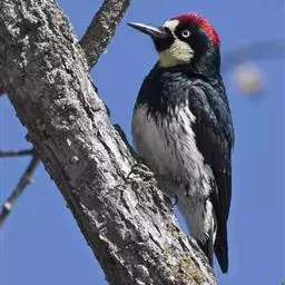橡树啄木鸟:体长20-23厘米。前额灰黄色,头顶、后颈红色。喉下部、腰和腹部白色,…