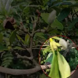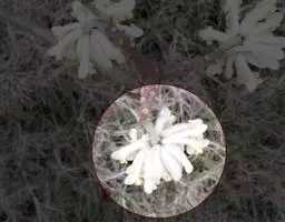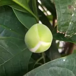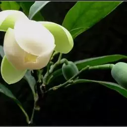 花白色,佛焰苞状苞片绿色,紧接花被片,花梗长约1.5厘米;花被片9,有透明油点,具约9条脉纹,外轮3片长圆形,长5.5-6厘米,宽2-2.2厘米;内两轮倒卵状椭圆形,比外轮稍短小,药隔伸长成短尖;雄蕊长约4厘米,花药长约2.8厘米,内向开裂;雌蕊群圆柱形,长约2厘米,直径3毫米,具约30枚雌蕊,雌蕊群柄长约1厘米。聚合果长3.5-4厘米;蓇葖扁球形,有白色皮孔。花期5月,果期8-9月。