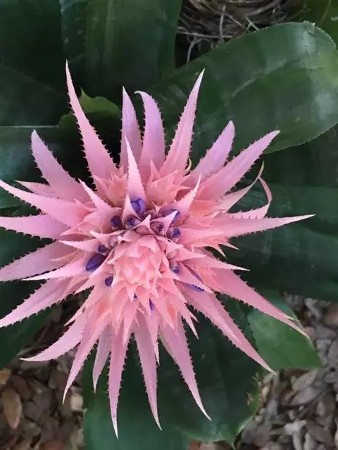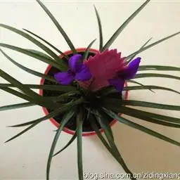 紫花凤梨,是凤梨科铁兰属的多年生草本植物。株高不及30厘米;叶片拱状线形,叶丛族生于短缩茎上,…