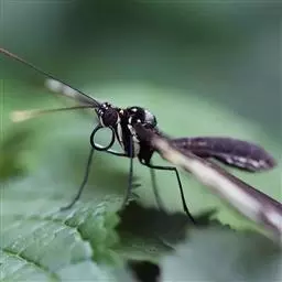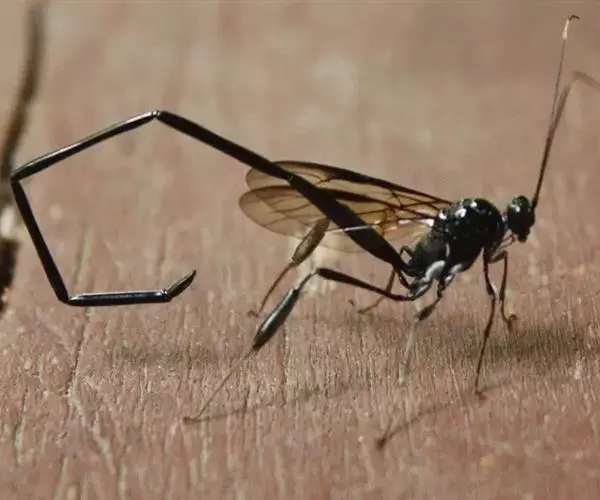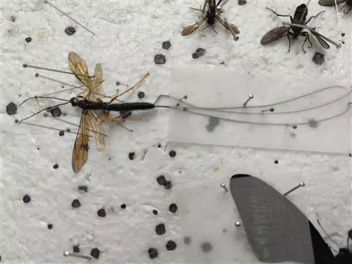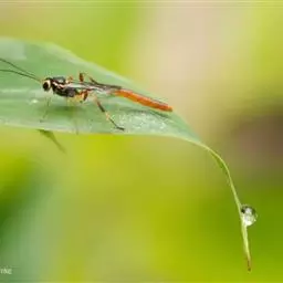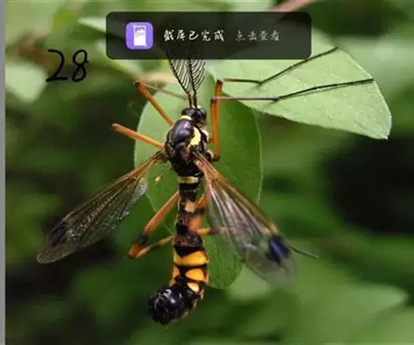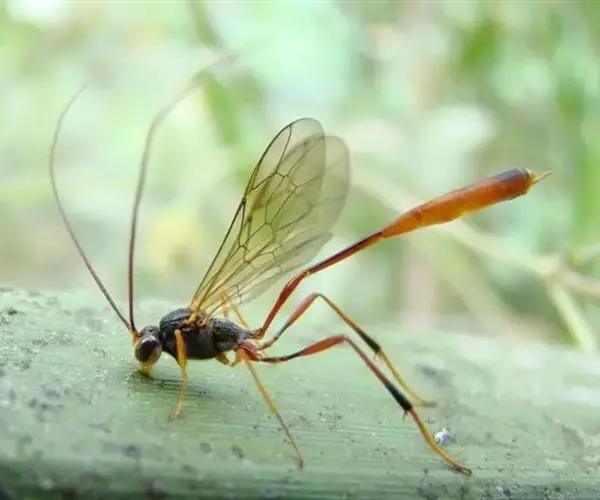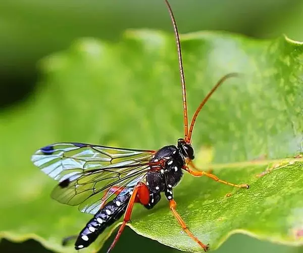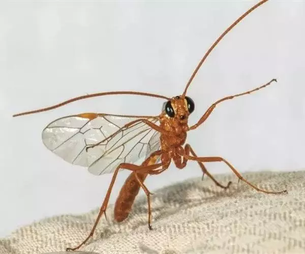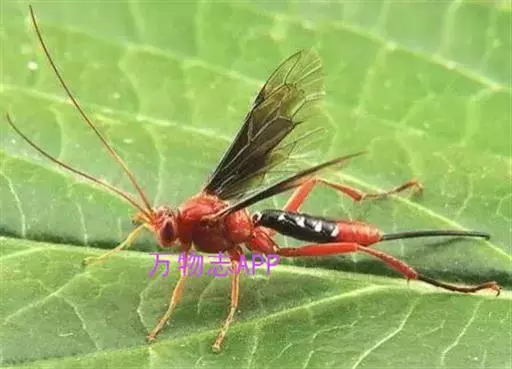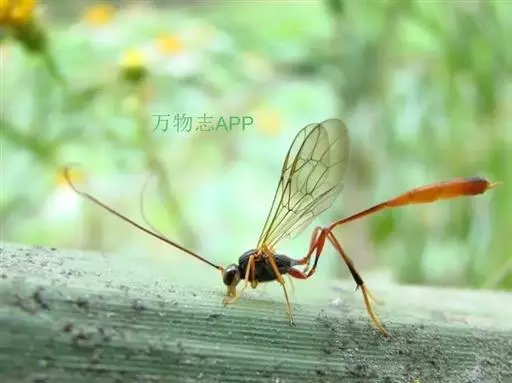 在昆虫世界中,有一种蜂生来体形娟瘦,头前一对细长的触角,尾后拖着三条宛如彩带的长丝,再加上两对透明的翅膀,飞起来,摇摇曳曳,甚有飘然欲仙之意,煞是好看!大概也正是因为这个缘故,这一类蜂就有了一个“姬蜂”的雅名。姬蜂大多是黄褐色,尾后的长带只有雌蜂才有,那是一条产卵器和两旁产卵器的鞘形成的三条长丝。这么长的产卵器也是昆虫中不多见的,有的种类甚至超过自己的体长呢。