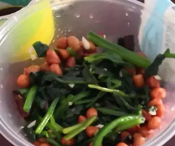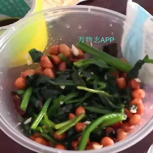 由花生米,菠菜调拌的凉菜。
