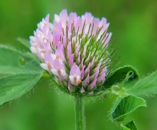 掌状三出复叶;托叶近卵形,膜质,每侧具脉纹8-9条,基部抱茎,先端离生部分渐尖,具锥 红车轴草的花和叶子 刺状尖头;叶柄较长,茎上部的叶柄短,被伸展毛或秃净;小叶卵状椭圆形至倒卵形,长1.5-3.5 (-5) cm,宽1-2cm,先端钝,有时微凹,基部阔楔形,两面疏生褐色长柔毛,叶面上常有V字形白斑,侧脉约15对,作20°角展开在叶边处分叉隆起,伸出形成不明显的钝齿;小叶柄短,长约1.5mm。