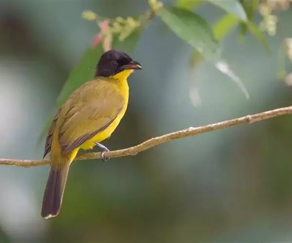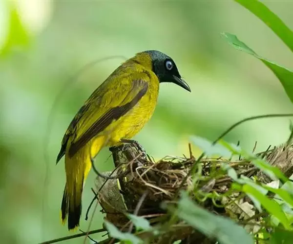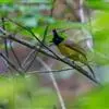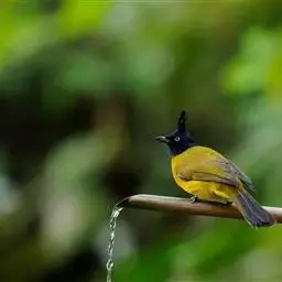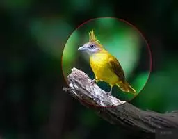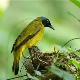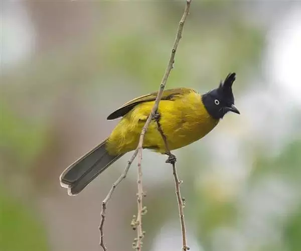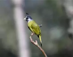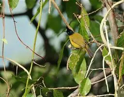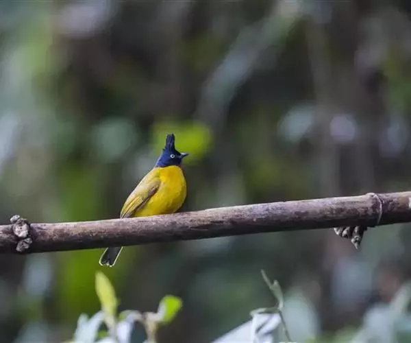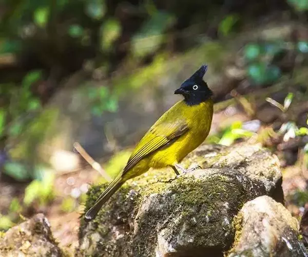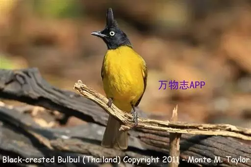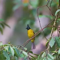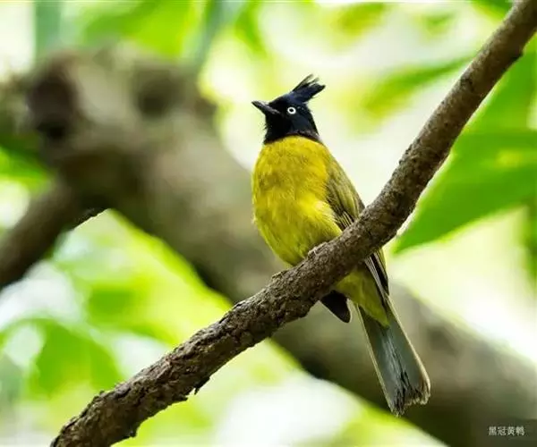 黑冠黄鹎(学名:Pycnonotus melanicterus):体长18-21厘米,是一种中等体型偏黄色鹎。整个头、颈、颏、喉黑色,头顶有显著直立的羽冠,黑色,上体褐橄榄黄绿色,下体橄榄黄色。虹膜偏红;嘴及脚黑色。
