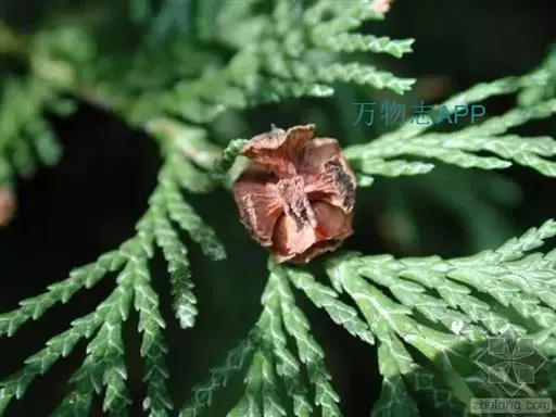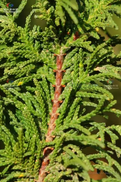 乔木,在原产地高达40米;树冠尖塔形;树皮红褐色,光滑,裂成薄片脱落;生鳞叶的小枝条扁平,排成一平面。鳞叶肥厚,先端钝,小枝上面中央之叶露出部分近方形,长1-1.5毫米,绿色,背部具纵脊,通常无腺点,侧面之叶对折呈倒卵状菱形,长约3毫米,小枝下面之叶微被白粉。雄球花椭圆形,长约3毫米,雄蕊6对,花药黄色。球果圆球形,径8-10毫米,熟时红褐色;种鳞4对,顶部五角形,平或中央稍凹,有小尖头;种子近圆形,长2.6-3毫米,两侧有窄翅。花期4月,球果10-11月成熟。