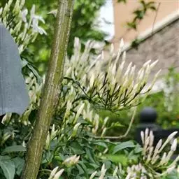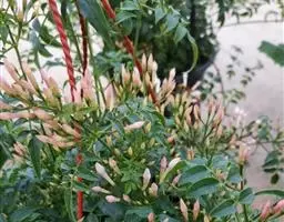 素馨花栽培可分为庭院、护栏旁栽植和阳台盆栽2种。庭院栽植只需在墙脚边挖塘定植后栓2m多长的铁丝3-5条供其攀爬即可;也可搭架栽培形成藤下乘凉。阳台盆栽选用较大的花盆,用熟化肥土栽植,栽好后在花盆中插上两根2m多长的小白竹、紫竹等供其攀爬即可。但花盆栽植由于土壤较少,在栽植2、3年后要全部或部分更换盆土。更换盆土可用手提塑料袋装取壤土,加上1/3鸡粪、羊粪等农家肥混均,浇水至手捏现水不滴后将塑料袋口打结扎紧放于向阳处发酵腐熟20-30d,将花盆旧土多数撬出后换上发过酵的肥土即可。 [5-6]